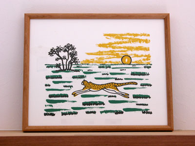 私は、陸上の哺乳類の中では、一番「チーターが好き」です。だから、「アフリカの草原をかけるチーター」をイメージして作成しました。最初、「3色刷り」と言われたときには、「3色でうまく作れるのか?」と思いましたが、工夫すれば、結構いけるもんですね(^^)。
